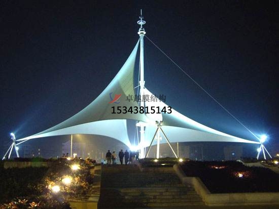 一個城市的中心區(qū)反映一個城市的地理風(fēng)貌和民族風(fēng)情,同時,也是一個城市文化發(fā)展程度的標志。而景觀設(shè)計要求其具有廣泛的可讀性、雅俗共賞,既有超凡脫俗的藝術(shù)價值,又能使大眾喜聞樂見與大眾息息相通。張拉膜以其鮮明的個性和標識性,應(yīng)用于城市小品設(shè)計中。