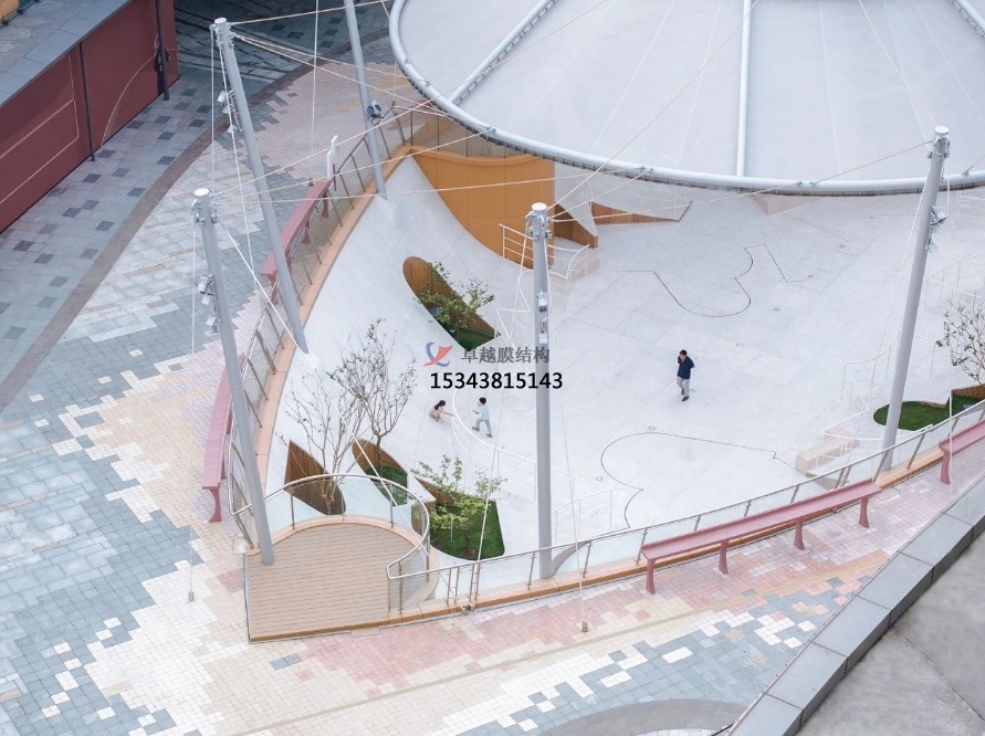 “浮庭”由上方如同水母般漂浮的半透明織物膜結(jié)構(gòu)與下方懸浮感的地景花園共同組成。膜結(jié)構(gòu)既成為了廣場的頂蓋,形成包覆與洞天的感受,也作為織連體引導(dǎo)主要流線銜接了室外幾個重要節(jié)點。結(jié)合原混凝土柱的加寬基礎(chǔ)上支起鋼柱,以懸吊與支承合作的形式將膜結(jié)構(gòu)撐起,減少了廣場中結(jié)構(gòu)的出現(xiàn)。
