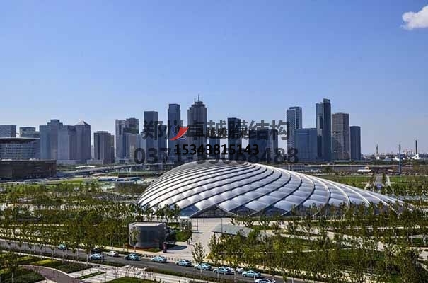 膜結構是一種建筑與結構完美結合的結構體系。它是用高強度柔性薄膜材料與支撐體系相結合形成具有一定剛度的穩(wěn)定曲面,能承受一定外荷載的空間結構形式。其造型自由輕巧、阻燃、制作簡易、安裝快捷、節(jié)能、安全等優(yōu)點,因而使它在世界各地受到廣泛應用。這種結構形式特別適用于大型體育場館、入口廊道、小品、公眾休閑娛樂廣場、展覽會場、購物中心等領域。