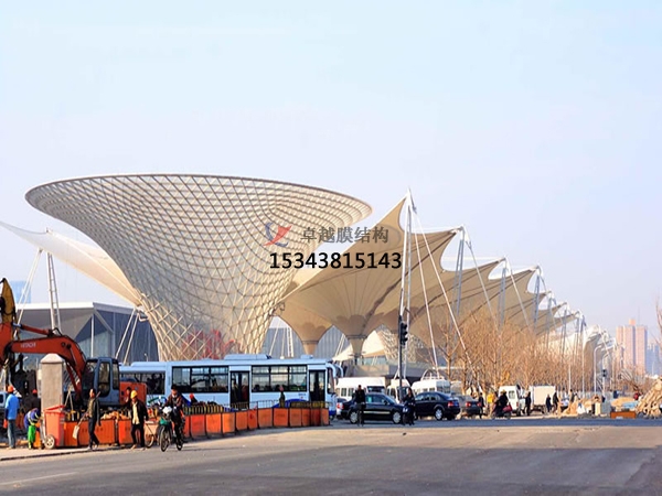 ?。?)西藏PTFE膜結(jié)構(gòu)的更大特點(diǎn)是強(qiáng)度高,中等強(qiáng)度的PTFE 膜厚度僅0.8mm,但它的拉伸強(qiáng)度已達(dá)到鋼材的水平;而且彈性模量較低,有利于膜材形成復(fù)雜的曲面造型;