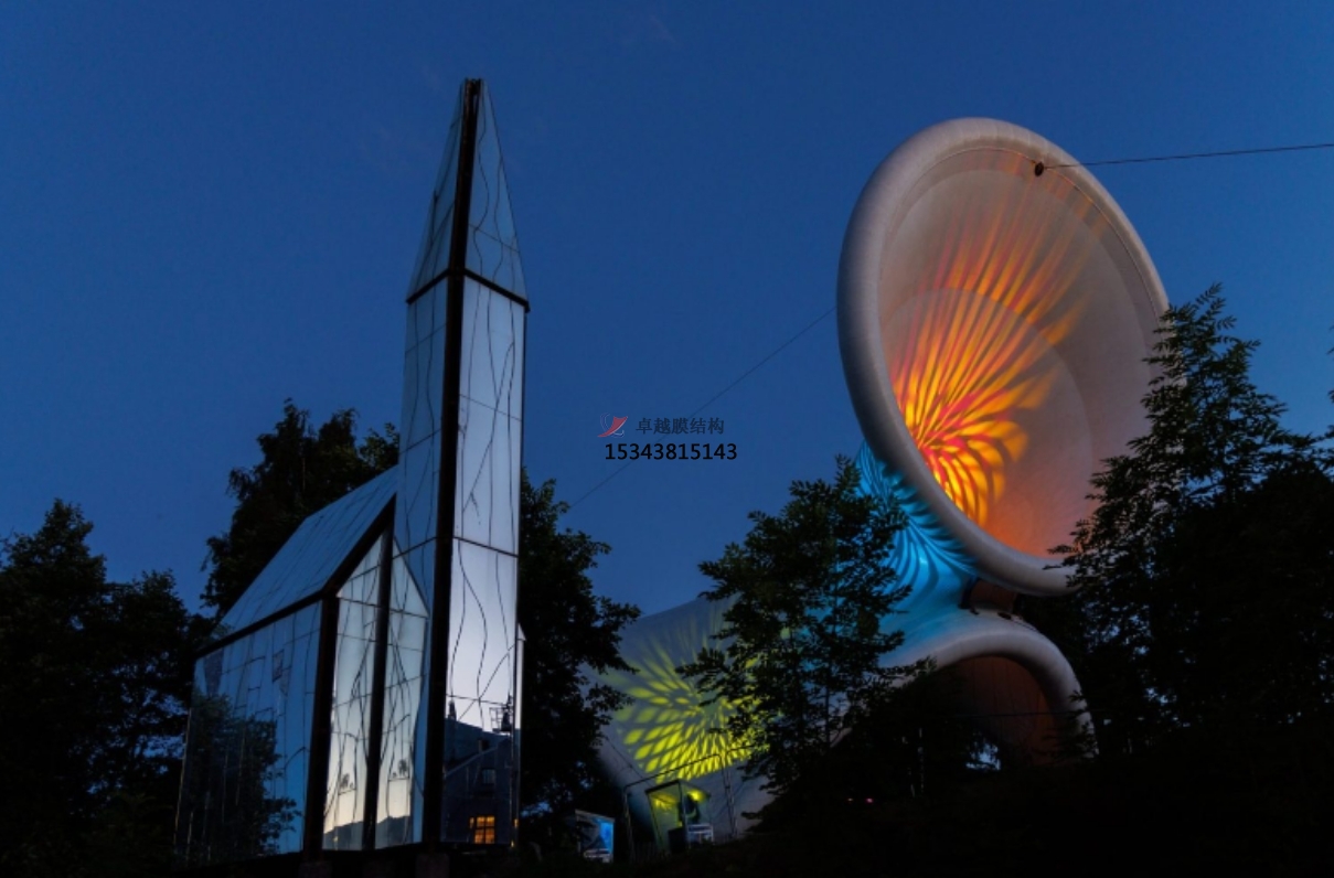 充氣膜張拉膜方便在節(jié)日期間快速豎立并吊裝到位。管狀骨架可以與織物覆蓋物一起拆卸和裝箱。