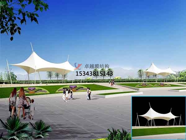 2、美觀:除了一般雨蓬不可比擬的實用、耐用、遮風(fēng)擋雨的功能外,景觀膜結(jié)構(gòu)罩棚更像是一座雕塑,一件藝術(shù)品,給人美的視覺享受。其柔美,其曲線,其剛?cè)岵?,其豐富造型,其潔白無瑕,讓人眼前一亮,回味悠長。因為景觀的頂篷是公路或地區(qū)設(shè)置名稱標(biāo)牌的主要位置,是公路或地區(qū)的重要標(biāo)志;所以使用景觀張拉膜結(jié)構(gòu)有較好的標(biāo)識招攬效果。